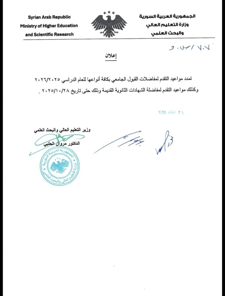 إعلان تمديد المفاضلة العامة للعام الدراسي للعام 2025-2026أكتوبر 21, 2025 المقالة السابقة تعلن جامعة حماة عن رغبتها بإجراء إعلان مزايدة بالظرف المختوم للاستثمار في الجامعة.