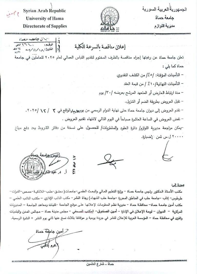 تعلن جامعة حماة عن رغبتها إجراء مناقصة بالظرف المختوم لتقديم اللباس العمالي لعام 2025 للعاملين في جامعة حماة