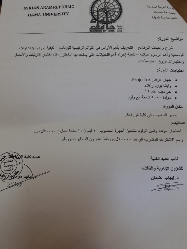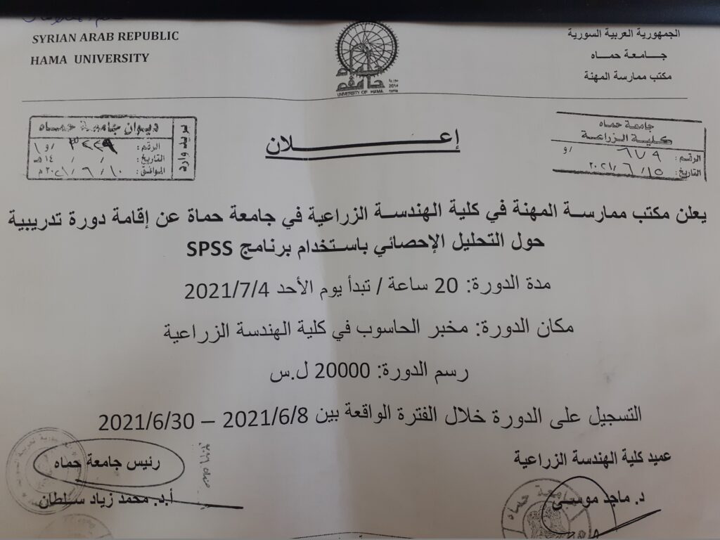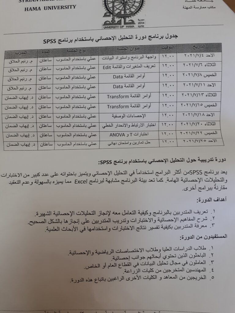 إعلان دورة تدريبية حول التحليل الإحصائي باستخدام برنامج SPSS في كلية الزراعة بحامعة حماه: مقالات مشابهة النتائج الامتحانية للفصل الثاني من العام الدراسي 2024-2025 4 أسابيع مضت نتائج طلاب الاستضافة في كلية الهندسة الزراعية للفصل الثاني من العام الدراسي 2024-2025 19 أغسطس، 2025 نتائج طلاب الاستضافة في كلية الهندسة الزراعية للفصل الأول من العام الدراسي 2024-2025 27 فبراير، 2025 شاركها Facebook Twitter Google +