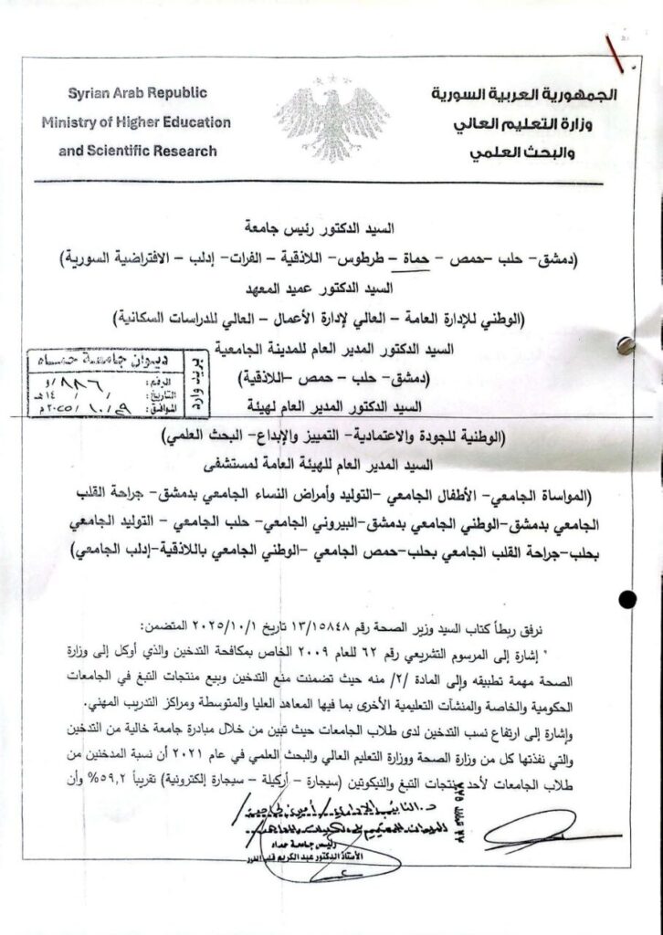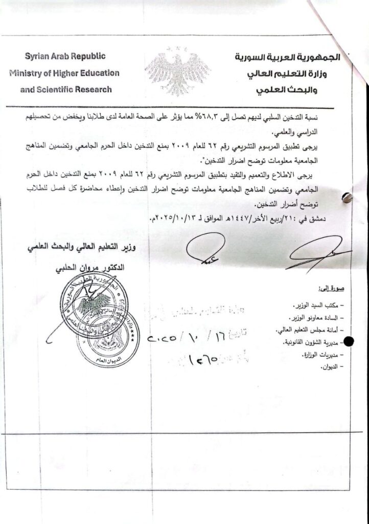 يُمنع التدخين وبيع منتجات التبغ في المديريات المركزية وكليات ومعاهد جامعة حماة والمنشآت التعليمية التابعة لها ومراكز التدريب وداخل الحرم الجامعي بتعميم صادر عن وزارة التعليم العالي والبحث العلمي.